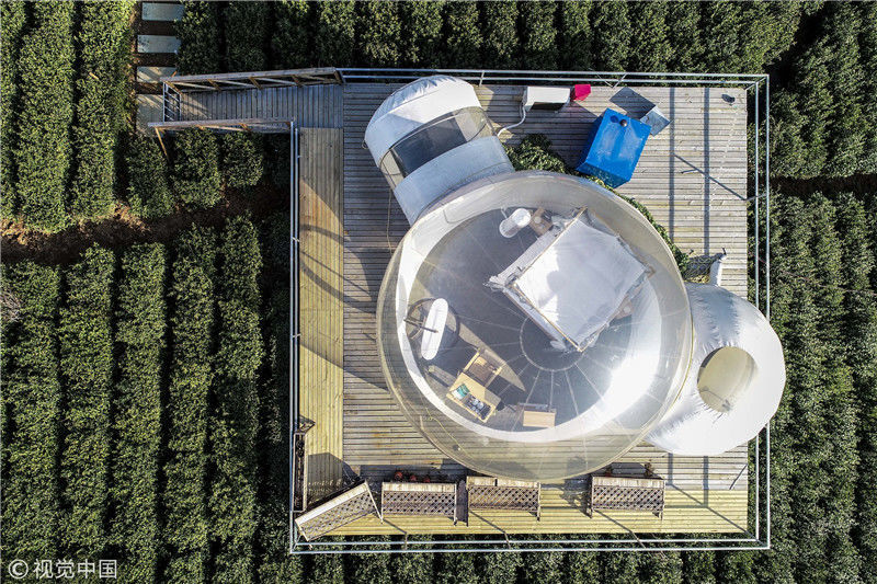 2018年12月18日,江蘇常州金壇茅山百畝茶田中的帳篷酒店和泡泡屋美不勝收。這里打造的帳篷,泡泡屋極具特色,可以讓游客與大自然零距離接觸,這種形式的“酒店”十分撩人,深受歡迎。