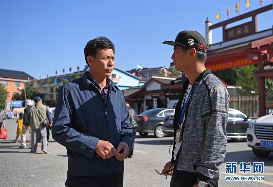 在龍虎山景區(qū)門(mén)口,舒港發(fā)囑咐做導(dǎo)游的小兒子舒志剛注意游客的安全(10月28日攝)。
