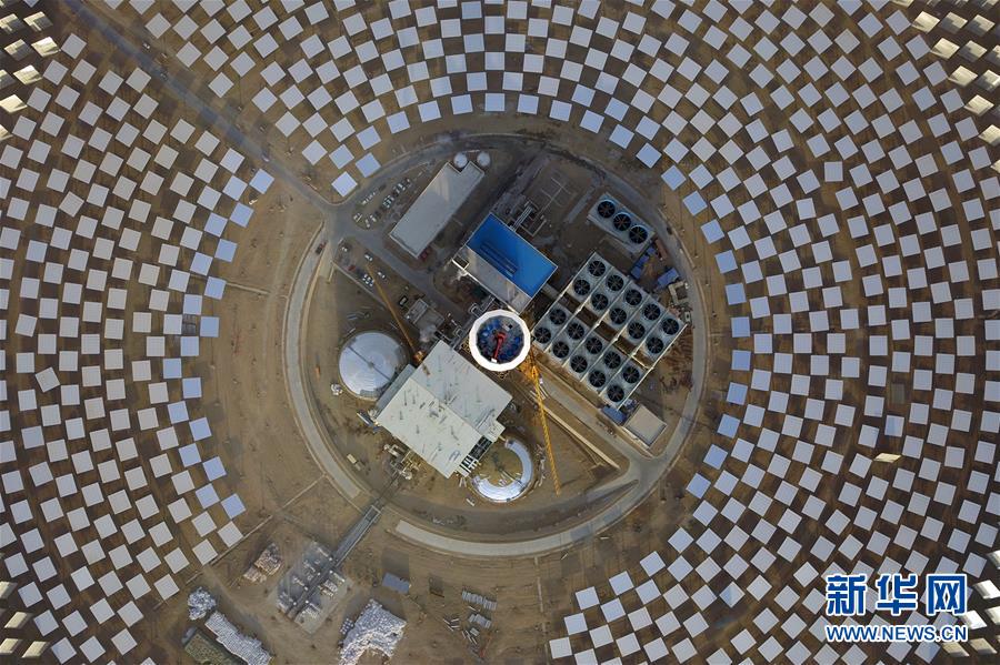 這是在敦煌市光電產(chǎn)業(yè)園區(qū)拍攝的敦煌100兆瓦熔鹽塔式光熱電站局部(12月25日無人機拍攝)。 新華社記者 范培珅 攝