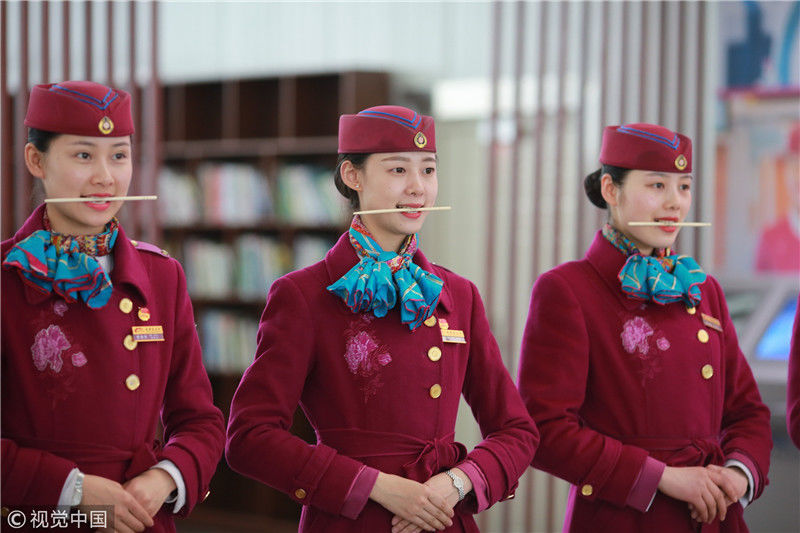 2018年12月27日,四川成都,為備戰(zhàn)即將開通的成雅鐵路,中國鐵路成都局集團有限公司成都客運段動車二隊對成雅動車的乘務人員進行理論、形體、服務禮儀等內(nèi)容的培訓。蘇志剛/視覺中國