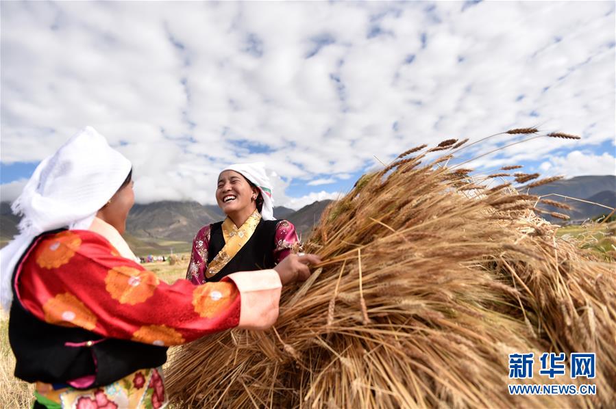 9月23日,首個中國農(nóng)民豐收節(jié),拉薩市林周縣松盤鄉(xiāng)松盤村兩名藏族農(nóng)民在田間聊天。 新華社記者 覺果 攝