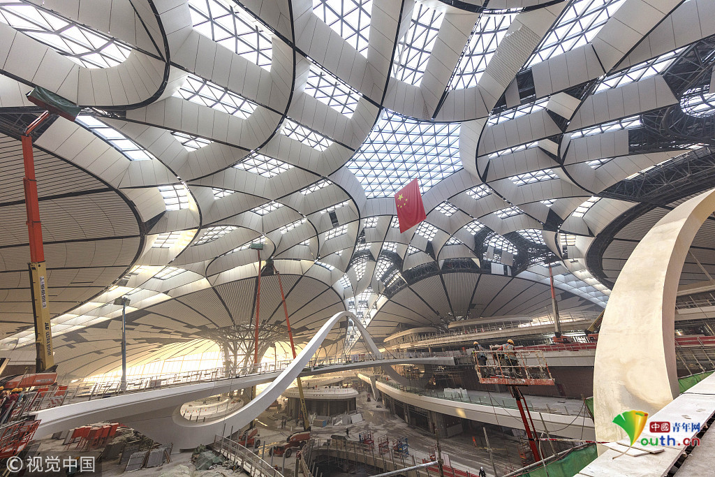2018年12月19日,北京大興國(guó)際機(jī)場(chǎng)航站樓的室內(nèi)裝修正在推進(jìn)中。視覺(jué)中國(guó)