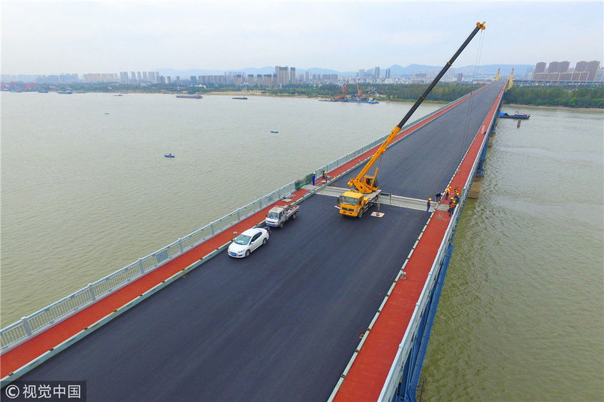 2018年10月19日,南京長江大橋主橋橋面鋪上瀝青,一輛吊車在南京長江大橋上作業(yè)。
