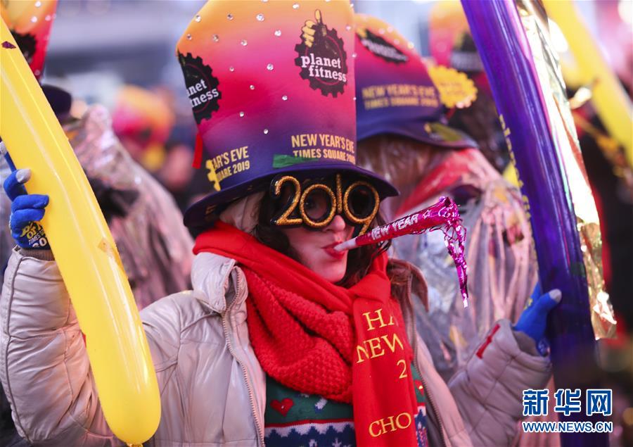 1月1日,在美國紐約時報廣場,一名女子參加跨年活動。 新華社記者王迎攝