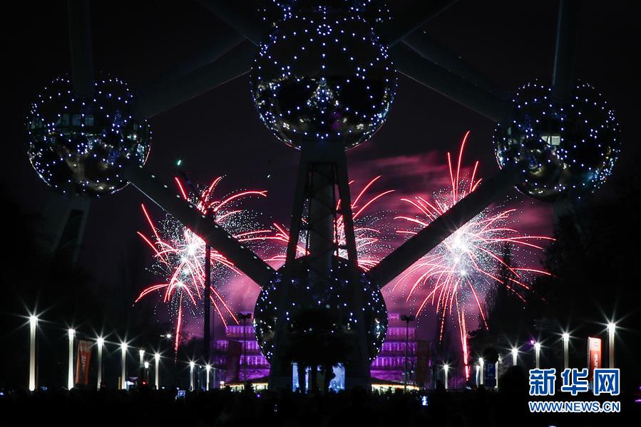 1月1日,比利時首都布魯塞爾的地標(biāo)性建筑——原子球塔附近煙花綻放。 新華社記者鄭煥松攝