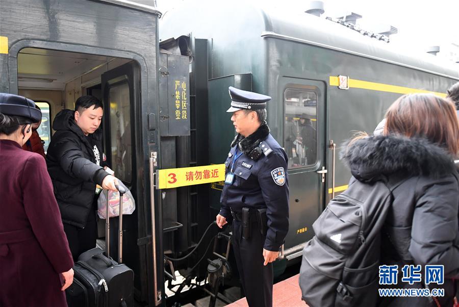 1月1日,在廣西南寧火車站,乘警楊鐵鳴在從越南河內(嘉林)開往中國南寧列車旁值勤。 新華社記者陸波岸攝