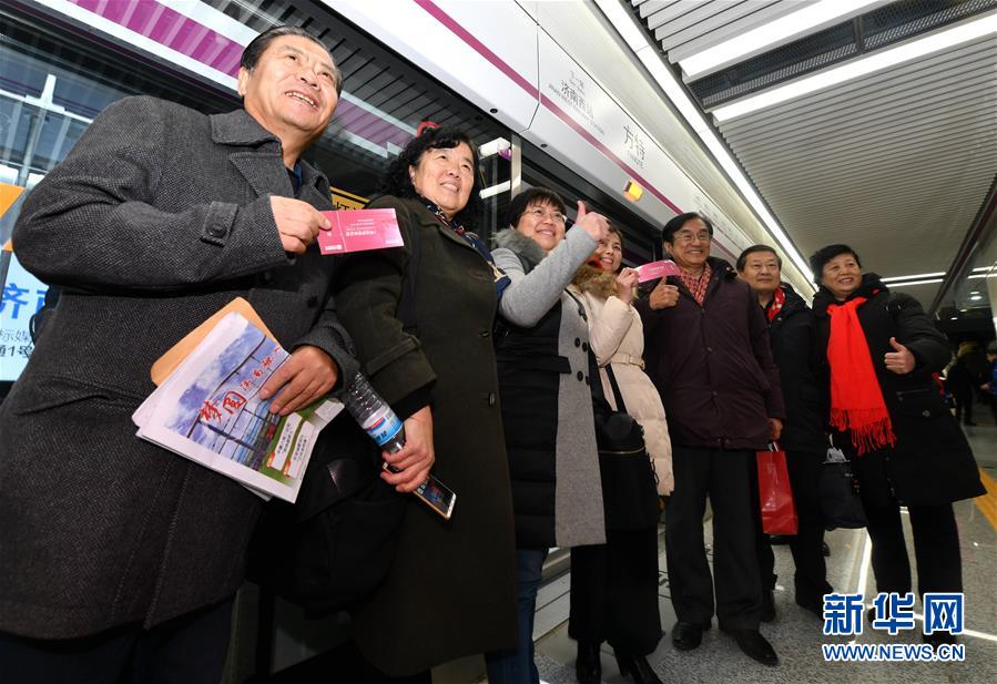 2019年1月1日,乘坐首發(fā)車的乘客在地鐵站內(nèi)拍照留念。 新華社記者朱崢攝