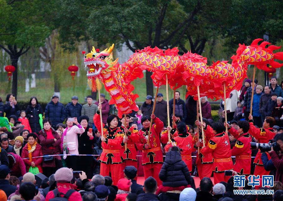 2019年1月1日,演員在展演活動上進(jìn)行舞龍表演。2019年元旦,浙江省桐鄉(xiāng)市濮院鎮(zhèn)舉辦新年“非遺文化藝術(shù)節(jié)”活動,濮院鎮(zhèn)下屬多個鄉(xiāng)村的傳統(tǒng)美食制作、手工藝品、非遺文化表演等鄉(xiāng)村特色非遺項目在濮院鎮(zhèn)中心廣場進(jìn)行集中展示展演。新華社記者 徐昱 攝
