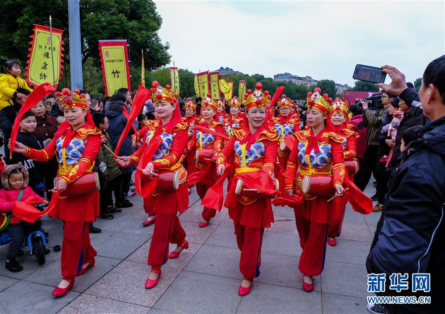 2019年1月1日,演員在展演活動上進(jìn)行腰鼓表演。2019年元旦,浙江省桐鄉(xiāng)市濮院鎮(zhèn)舉辦新年“非遺文化藝術(shù)節(jié)”活動,濮院鎮(zhèn)下屬多個鄉(xiāng)村的傳統(tǒng)美食制作、手工藝品、非遺文化表演等鄉(xiāng)村特色非遺項目在濮院鎮(zhèn)中心廣場進(jìn)行集中展示展演。新華社記者 徐昱 攝