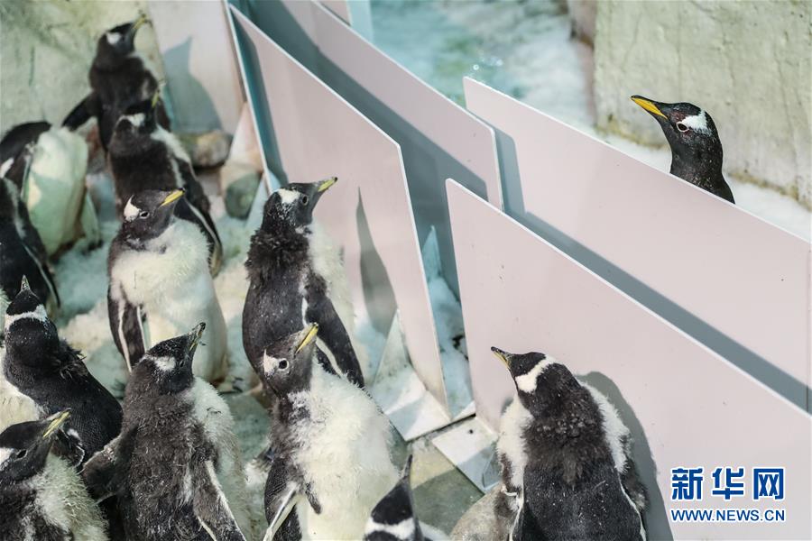 1月9日,成年白眉企鵝(右)在隔離板外關注自己的寶寶。 新華社記者 潘昱龍 攝