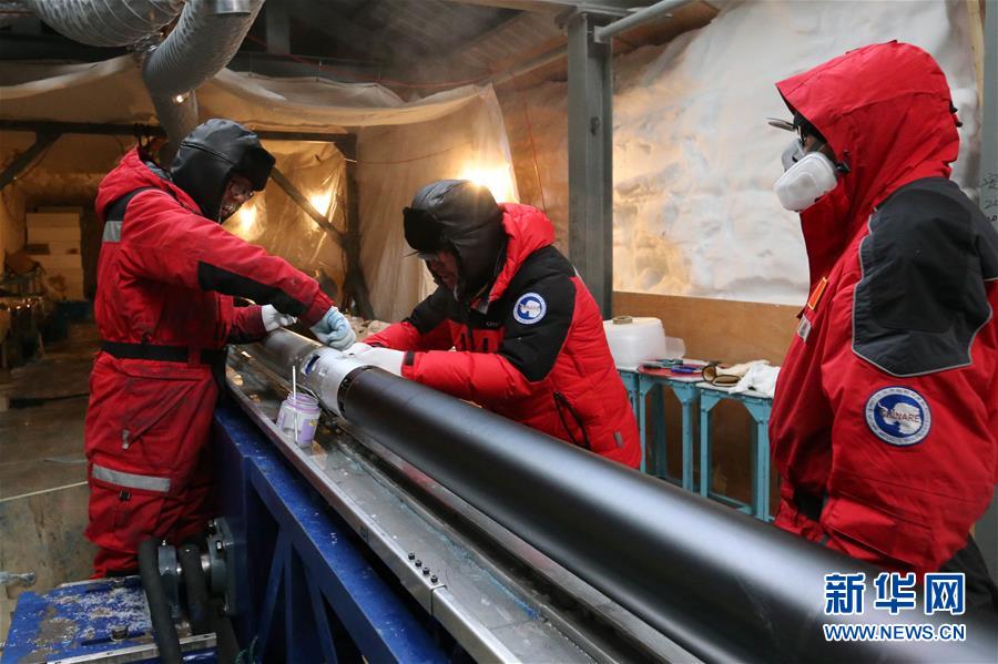 科考隊(duì)員清理深冰芯鉆具(1月12日攝)。 新華社記者 劉詩(shī)平 攝