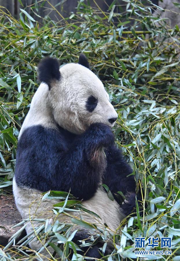 1月13日,大熊貓在北京動物園恒溫的熊貓館內吃竹子。 新華社記者 李欣 攝