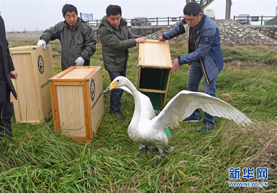 1月14日,工作人員正在放飛一只大天鵝。 新華社記者 萬象 攝