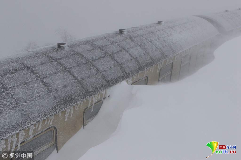 德國(guó)多地大雪紛飛 火車被困半路進(jìn)退不得