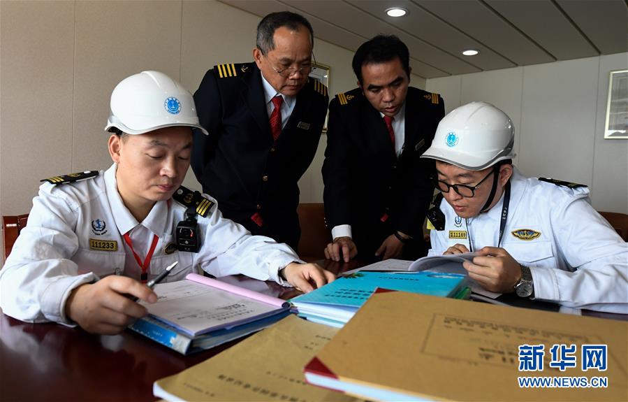 1月15日,??诤J戮止ぷ魅藛T在粵海鐵4號(hào)客滾船上檢查文書(shū)文件。 新華社記者 楊冠宇 攝