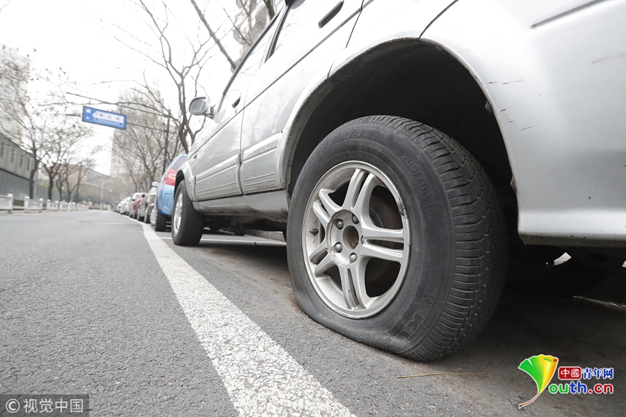 因?yàn)槭敲赓M(fèi)停車(chē)位,就成為僵尸車(chē)的天堂。粗粗?jǐn)?shù)了一遍,至少有10余輛汽車(chē)裹著車(chē)衣,被落葉等臟物覆蓋;有的車(chē)最后的年檢標(biāo)志是3年前,車(chē)胎漏氣,車(chē)內(nèi)也是堆著雜物。
