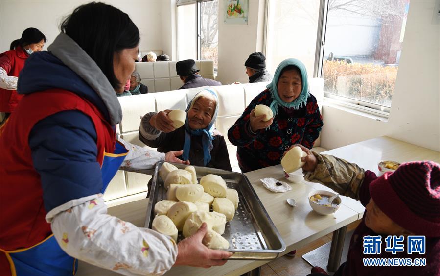 1月15日,村里的志愿者為就餐的老人分發(fā)饅頭。新華社記者王凱攝