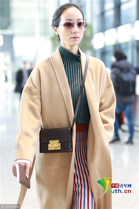 2019年1月17日,上海,韓雪現(xiàn)身機(jī)場,穿著條紋紗裙露出小腿,十分抗凍,她搭配經(jīng)典的駝色大衣,氣質(zhì)出眾在機(jī)場人群中相當(dāng)搶鏡。