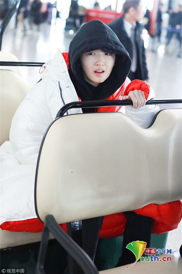 1月23日,北京,周冬雨現(xiàn)身機場。她用黑色連衣帽罩頭襯托巴掌臉,把下巴擱在行李車推桿上的雙手上呆萌可愛 。