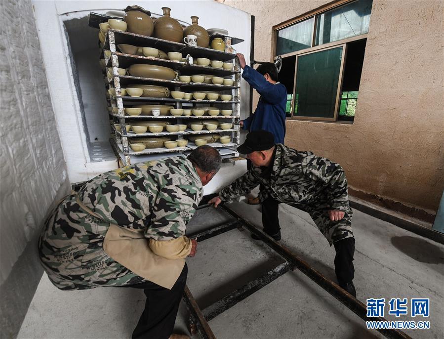 2月16日,陳新華(右)把農(nóng)歷新年第一窯燒制好的作品拉出窯爐。