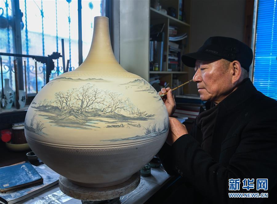 2月16日,陳新華在一個(gè)婺州窯大容瓶上進(jìn)行釉下褐彩的創(chuàng)作。新華社記者 徐昱 攝