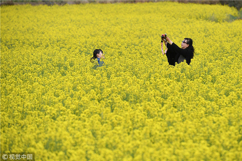 2019年3月1日,游客在花海中拍照。近日,位于云南省安寧市的大片油菜花進入盛花期,吸引民眾到此賞花。