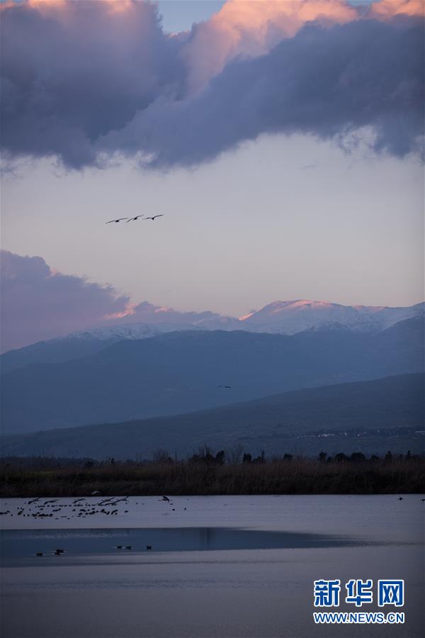 3月7日,在以色列阿格蒙胡拉鳥類和自然公園,幾只灰鶴在天空中飛翔。新華社記者郭昱攝