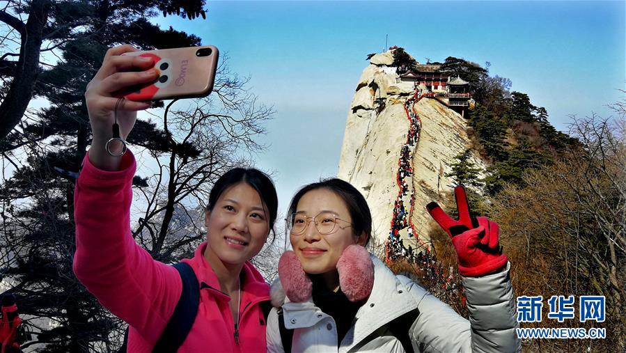 3月9日,游人在華山游覽拍照。 隨著氣溫回升,陜西著名風(fēng)景區(qū)華山進入旅游旺季。 新華社記者 陶明 攝