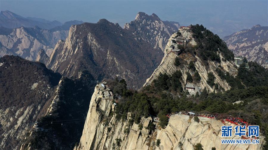 3月9日,游人在華山南峰游覽(無人機拍攝)。 隨著氣溫回升,陜西著名風(fēng)景區(qū)華山進入旅游旺季。 新華社記者 陶明 攝