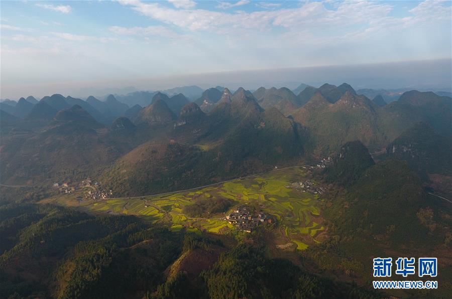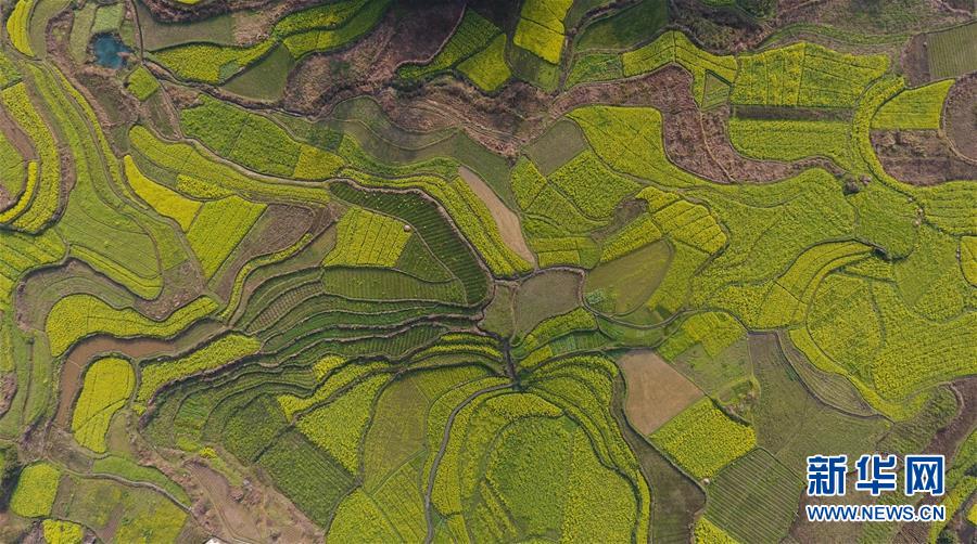 3月20日在貴州錦屏縣敦寨鎮(zhèn)拍攝的春景(無人機拍攝)。春分將至,貴州各地成片的油菜花漸次綻放,如同金色的地毯鋪上云貴高原。 新華社記者 歐東衢 攝