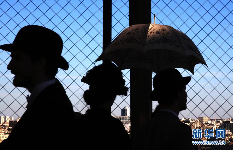 3月30日,在法國巴黎,音樂劇《300米高塔》的演員身著19世紀(jì)服裝站在埃菲爾鐵塔一層平臺(tái)上。于1889年3月31日正式落成的法國巴黎埃菲爾鐵塔迎來130歲生日。從30日起,包括演出、冒險(xiǎn)游戲、圖片展在內(nèi)的多項(xiàng)活動(dòng)在埃菲爾鐵塔舉行,為這座宏偉建筑慶生。新華社記者 高靜 攝