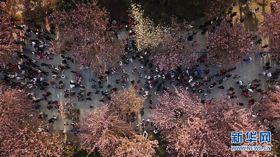 3月31日,游客在中國科學技術(shù)大學東區(qū)觀賞櫻花(無人機拍攝)。
