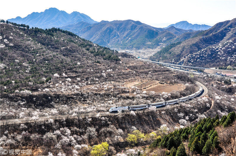 2019年3月22日,北京居庸關(guān)附近的山花盛開,S2線列車穿行在花海之中,構(gòu)成一幅美麗的畫面。時永平/千龍圖像/視覺中國 編輯/陳進(jìn)