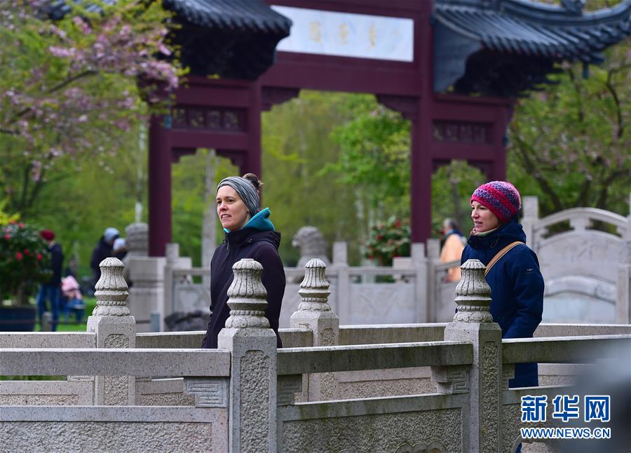 2019年4月13日,在德國(guó)曼海姆,游客在中式園林“多景園”內(nèi)游玩?!岸嗑皥@”位于曼海姆市路易森公園內(nèi),占地約6000平方米,建筑面積約1500平方米,是目前歐洲最為完整的中國(guó)古典園林建筑群落之一。 新華社記者逯陽(yáng)攝
