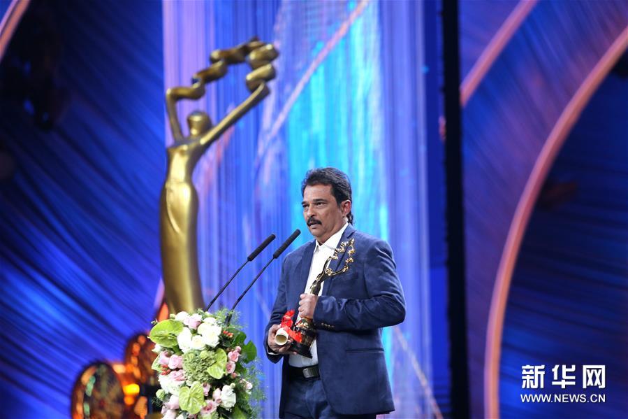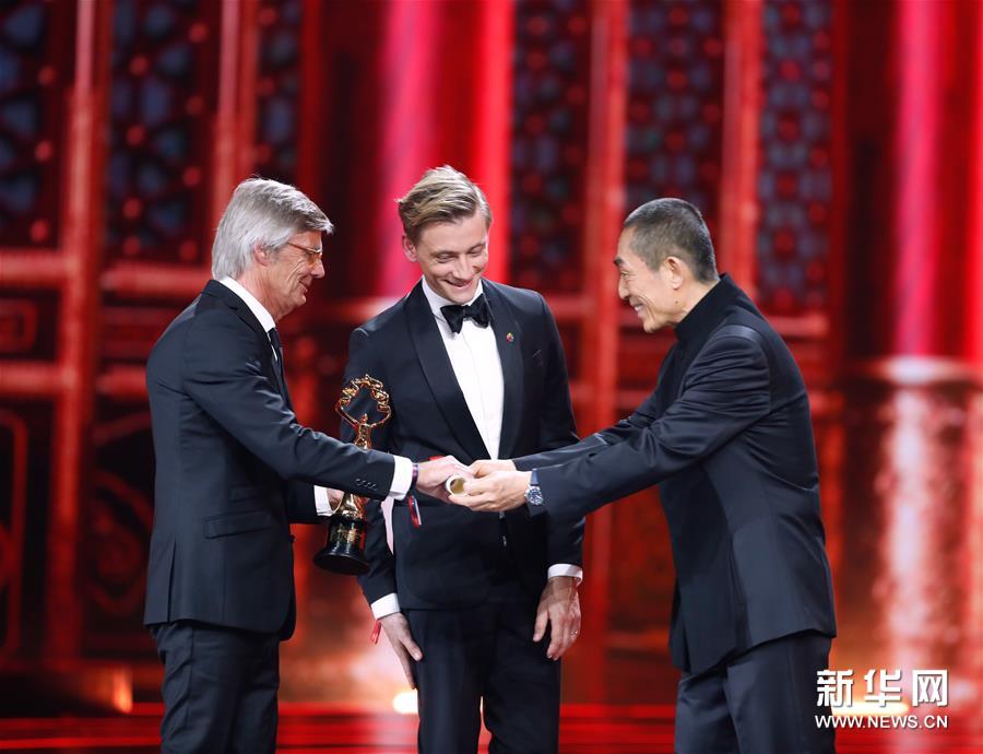 4月20日,影片《幸運(yùn)兒彼爾》獲得“天壇獎最佳影片獎”,張藝謀(右)為領(lǐng)獎?wù)撸ㄗ螅╊C獎。 當(dāng)日,第九屆北京國際電影節(jié)閉幕式暨頒獎典禮在北京懷柔國家中影數(shù)字制作基地舉行。 新華社記者 沈伯韓 攝