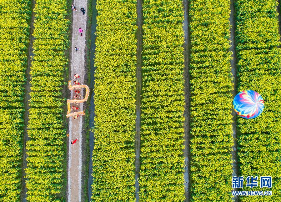 村民舞龍隊在浙江省湖州市吳興區(qū)八里店鎮(zhèn)移沿山生態(tài)景區(qū)的油菜花田里表演舞龍(3月30日無人機拍攝)。 新華社記者 徐昱 攝