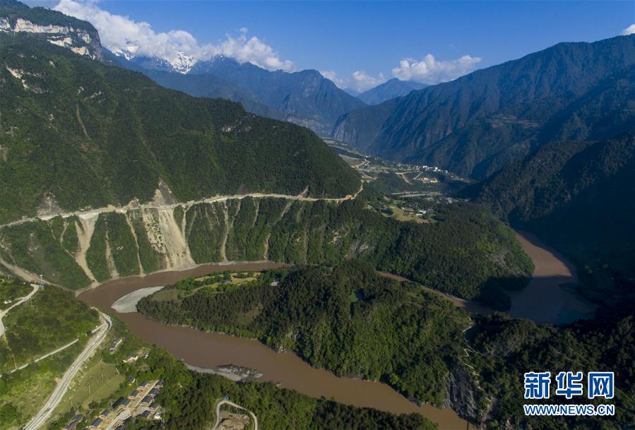 這是4月27日在云南省貢山獨龍族怒族自治縣丙中洛鎮(zhèn)拍攝的“怒江第一灣”(無人機拍攝)。 怒江自青藏高原一路奔騰向南流至云南省貢山獨龍族怒族自治縣丙中洛鎮(zhèn),高黎貢山與碧羅雪山夾江而立,江水順山勢急轉(zhuǎn)形成了一個氣勢磅礴的半圓形大灣,被稱為“怒江第一灣”。 新華社記者 江文耀 攝