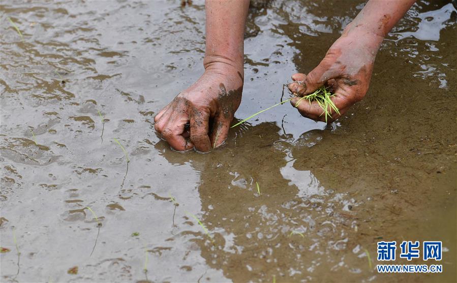在黔桂烏英苗寨,村民在田間插秧(4月16日攝)。  新華社記者 黃孝邦 攝