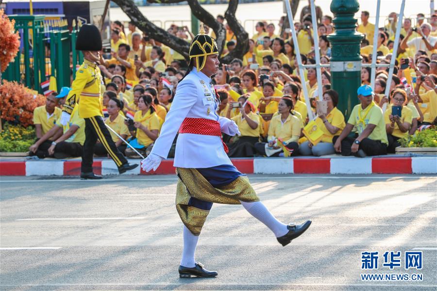 5月5日,儀仗隊(duì)在曼谷大王宮附近舉行的泰國(guó)國(guó)王加冕典禮巡游上列隊(duì)前進(jìn)。  新華社記者 張可任 攝