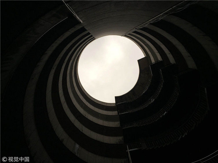 2018年12月6日,重慶江北紅旗河溝汽車站內(nèi),有一棟獨特的八層圓環(huán)狀建筑,底層每天有不少進出站的客車通行。據(jù)悉,這棟樓建于1990年,曾經(jīng)是車站旅館,如今一、二兩層用于車站辦公,其余樓層已廢棄。為確保安全,三層以上已經(jīng)被封鎖。圖為公交車穿過8層空心圓筒樓。徐勇/視覺中國