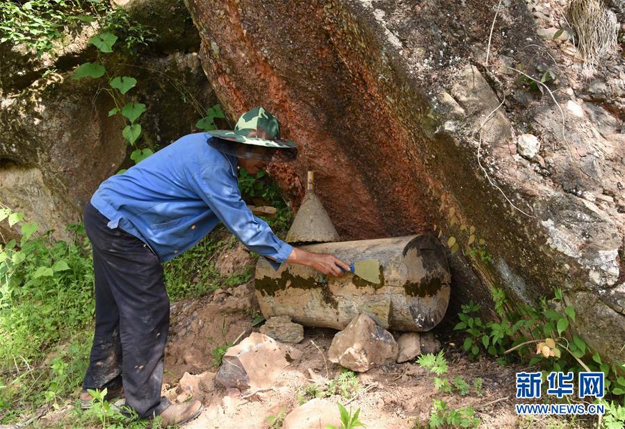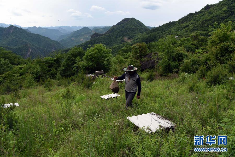 5月10日,在甘肅省隴南市徽縣大河店鎮(zhèn)硬灣村,蜂農(nóng)周仲頤在收蜂。 甘肅省隴南市徽縣大河店鎮(zhèn)硬灣村位于秦巴山區(qū)深處,2017年,在當(dāng)?shù)卣姆龀窒?,龍崖老巢蜜養(yǎng)殖農(nóng)民專業(yè)合作社成立,蜂農(nóng)們將傳統(tǒng)養(yǎng)蜂技藝和現(xiàn)代加工方式相結(jié)合,并通過(guò)電商等渠道打開銷路,有效帶動(dòng)了當(dāng)?shù)刎毨Т迕衩撠氈赂弧D壳罢麄€(gè)合作社共有蜂箱2000余個(gè),每箱每年可帶來(lái)三四千元的收入。 新華社記者 馬寧 攝