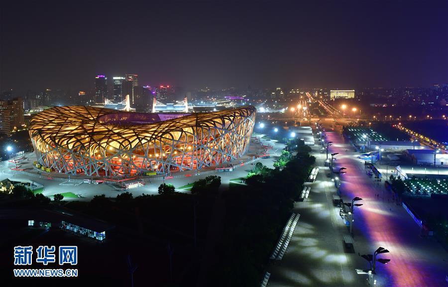 “鳥巢”燈光璀璨(5月14日攝)。 當(dāng)晚,一場(chǎng)“空間光影秀”在北京上演。 新華社記者 沈伯韓 攝