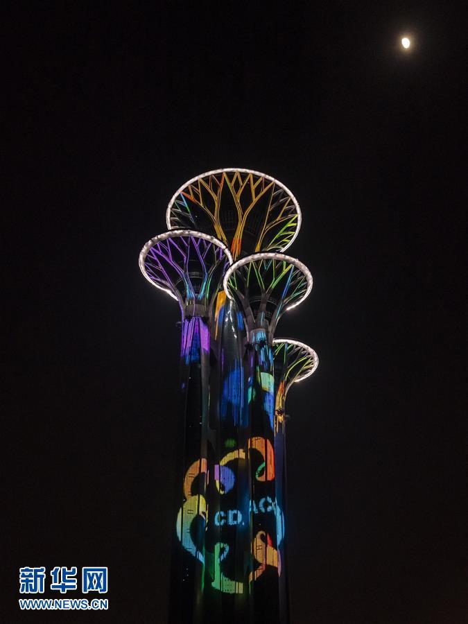 奧林匹克塔上演“空間光影秀”(5月14日攝)。 當晚,一場“空間光影秀”在北京上演。 新華社記者 沈伯韓 攝