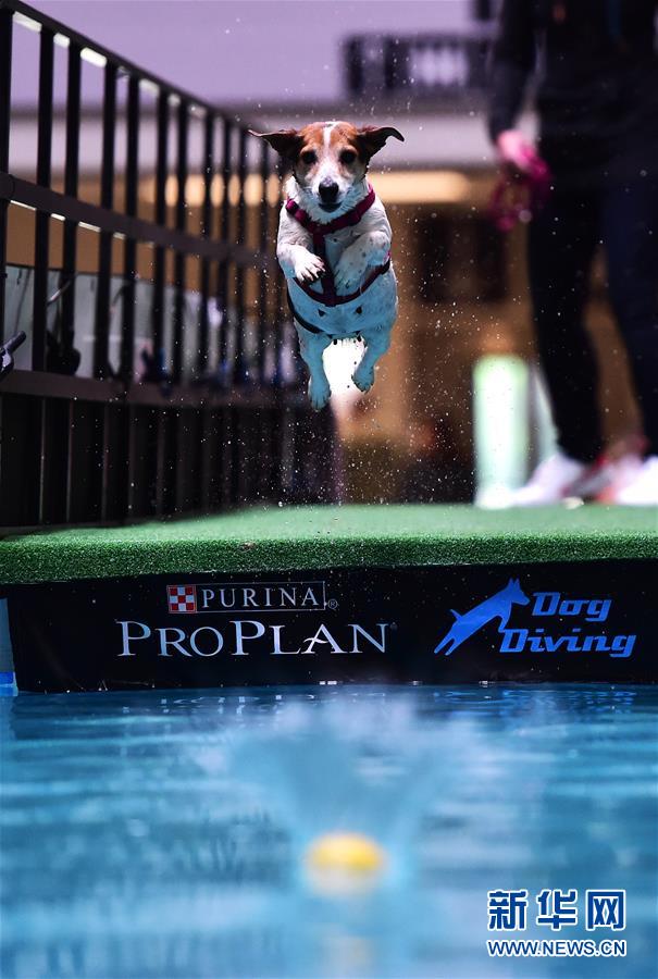 5月19日,在德國多特蒙德舉行的寵物展上,一只杰克羅素梗參加跳水比賽。 為期三天的德國多特蒙德“狗和貓”寵物展19日落幕。寵物展期間,人們帶著自己的“萌寵”來到會場,參與寵物跳水、舞蹈、選美等趣味比賽,并與其他寵物愛好者及展商交流互動(dòng)。 新華社記者逯陽攝