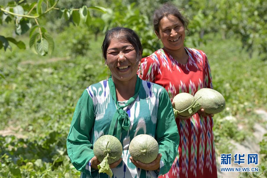 6月23日,在新疆喀什地區(qū)巴楚縣,瓜農(nóng)展示剛采摘的留香瓜。新華社記者 丁磊 攝
