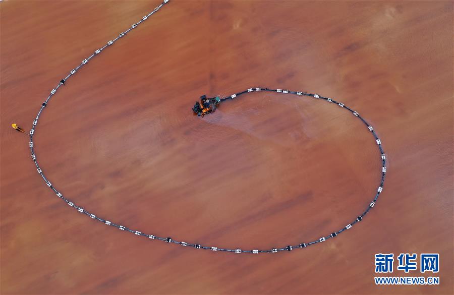 7月3日,唐山海港經濟開發(fā)區(qū)大清河鹽場的工人在操作機械設備收獲春鹽(無人機拍攝)。