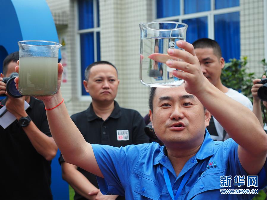 在宜賓市南岸污水處理廠,工作人員現(xiàn)場取樣,向記者展示生活污水處理前后的對比(7月3日攝)。新華社記者 王迪 攝