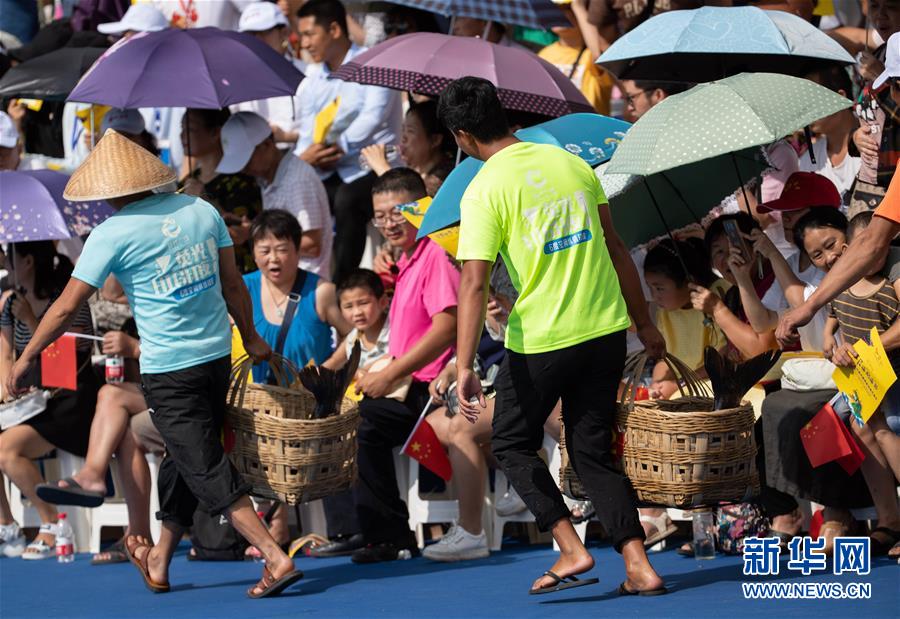7月27日,在西昌邛海,漁民提著捕到的大魚(yú)準(zhǔn)備參加比賽。新華社記者江宏景攝