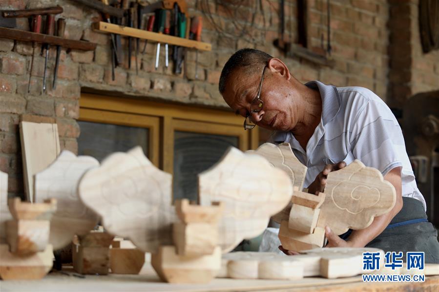 8月7日,在石家莊市井陘礦區(qū)橫西村,韓保元在檢查斗拱。 新華社記者駱學(xué)峰攝