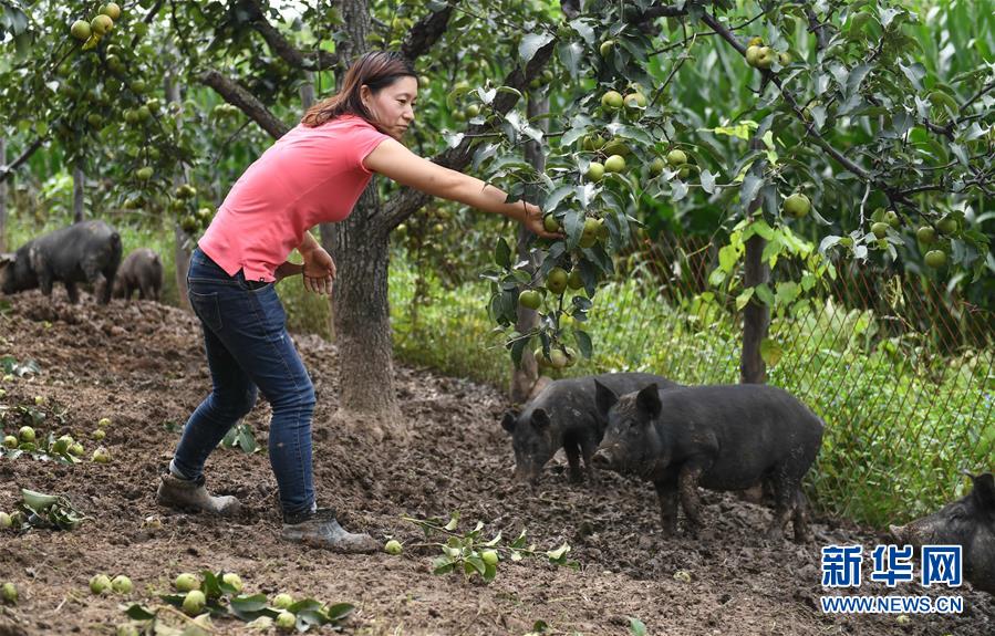 8月20日,康丹丹在果園內(nèi)摘果樹上的蘋果梨喂豬。新華社記者 王昊飛 攝